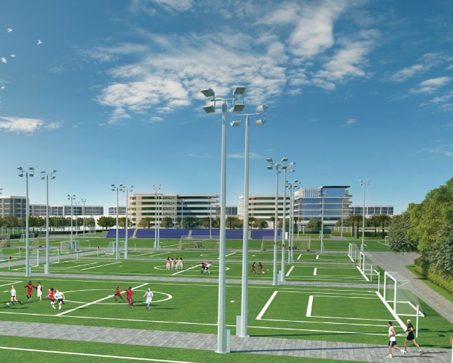 golf course, a club house, sports academies, an aquatic center witn an